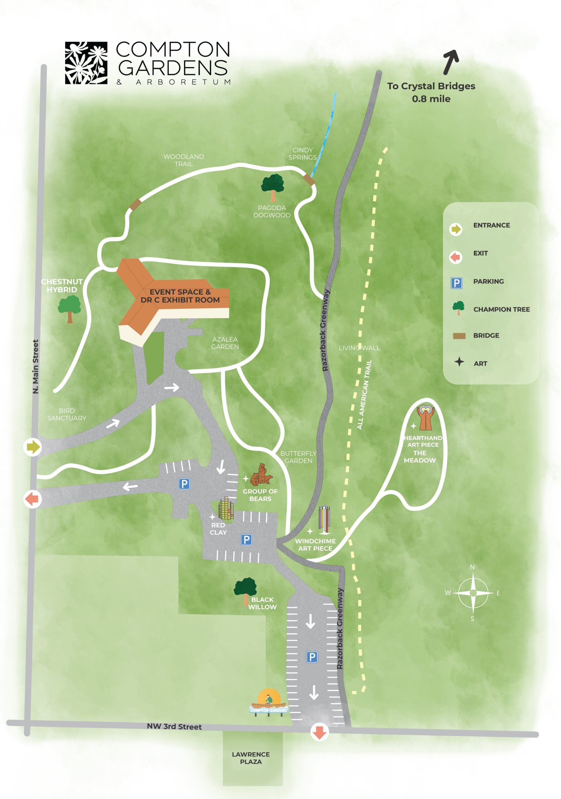Compton Gardens & Arboretum is a peaceful seven-acre haven in the heart of Bentonville, showcasing the natural beauty and biodiversity of the Ozarks. Walk or bike through trails lined with native plants, towering trees, and seasonal blooms in this vibrant urban greenspace.